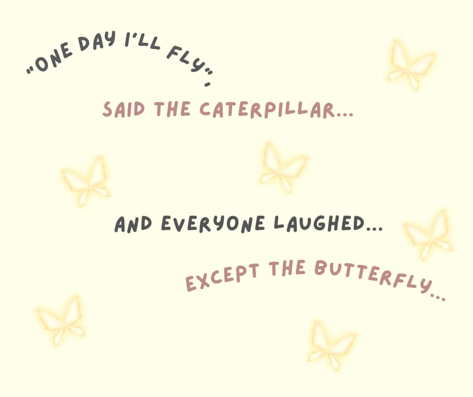 "One day I'll fly, said the caterpillar... and everyone laughed, except the butterfly..." This quote was framed, and placed on the wall of the restaurant where I sat with my mother on Saturday night. It was there, just behind her. Almost winking at me and reminding me to smile (dinner with someone who's brain is gradually getting destroyed by Alzheimer's is... well... there are no words really...) And I thought: "I must share this with my followers next week." This email is for you, Reader,...